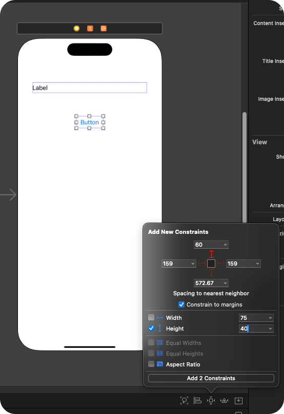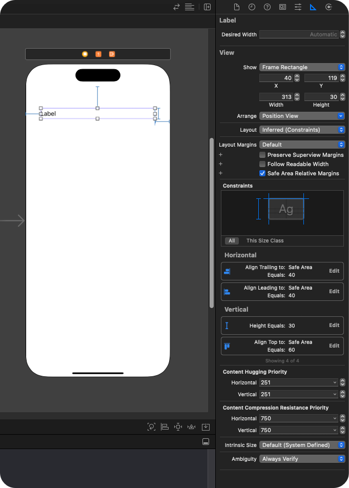 제약조건을 추가할 때 이번에는 위에 Label이 있기때문에 상단의 제약조건에서 60을 띄운다는 조건은 Label을 기준으로 띄우게 된다.