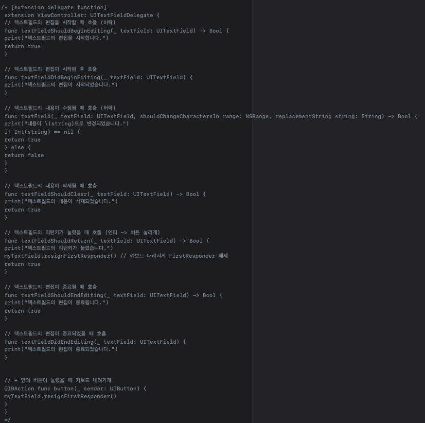 - extension ViewController: UITextFieldDelegate 를 추가 후 델리게이트 메소드 선택적 추가
